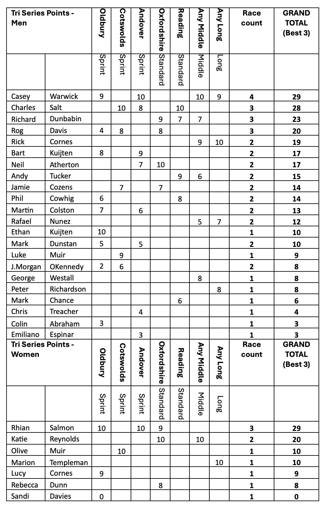 Best three performances - per triathlete - will score points in the NV Triathlon Series Table